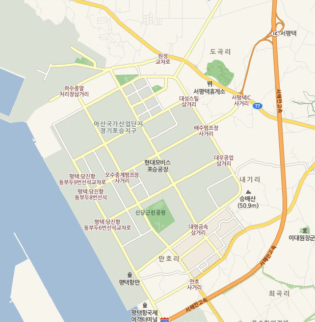 서해안 고속도로 서평택IC 나오신 후 포승공단로를 따라 1.4Km 이동 → 배수펌프장사거리에서 '평택항, 국제여객터미널' 방면으로 좌회전 → 포승공단순환로를 따라 2.66Km 이동 → 유성TNS사거리에서 '당진,아산' 방면으로 좌회전 → 평택항로를 따라 866m 이동 → 우회전 → 하만호길을 따라 164m 이동 → 우회전 → 하만호길을 따라 314m 이동 → 도착